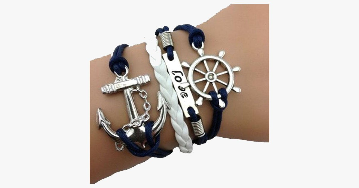 This beautiful bracelet will give you a trendy take on all the things you love about life at sea!? Detailed with contrasting white and navy colored tied and braided vegan-friendly leather bands.? This bracelet is crafted with a large anchor charm, a bar engraved with the word “love” and a whimsical wheel charm.