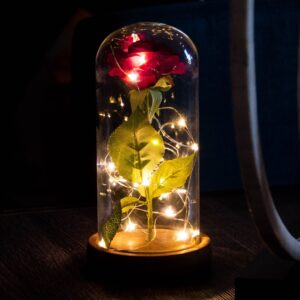 This captivating Enchanted Rose Flower Lamp is incredibly beautiful! What a lovely and unique lamp to set on a table or what-not shelf. The single red rose, surrounded by tiny sparkling white lights, is enclosed under a beautiful glass cloche, a timeless still-life. What an eye-catching addition to any room of your home! This exquisite lamp is crafted using quality materials and long lasting LED lights. Due to the handcrafted nature of this product there will be variations in color, size and design, making each a remarkable piece of art! Each wooden base comes in your choice of color, either natural or espresso.