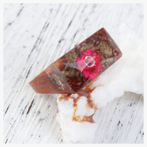 All our rings are handmade by woods craftsmen. Ethereal Blossom Flower Wood Ring is made of clear resin. The ring displays pink flower blossoms and white snow that glows in the dark. Makes the perfect gift for any flower and plants lover. We ship worldwide!