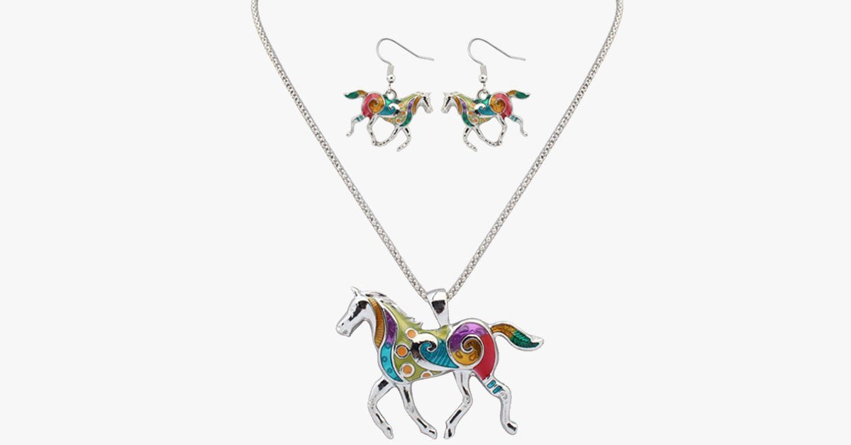 This unique Horse Hippie Pendant Set are the perfect accessories to express your individuality. Show your love for horses with this multi-colored horse pendant set. This one of a kind necklace and earrings set is a must have and makes a great gift!