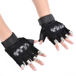 - EXCEPTIONAL PARTY ACCESSORY: These rave gloves are the evolution of a makeshift accessory that has been used by club performers for decades. It?s basically 4 high-powered laser pointers mounted on each fingerless gloves, emitting colorful rays of light that captivate the attention of every single person in the room. Take them to a rave, house party, or any kind of event with a dimly lit room and a bunch of bored bystanders to turn it into an EDM festival with you as the main feature act.