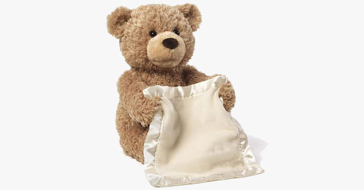 The Peek-A-Boo Bear features movable mouth and arms, as well as a blanket that is accented with satin for a great touch and feel sensation for baby. At the push of a button on the bears foot, the bear recites one of six different phrases and hides behind a blanket before popping back out to delight baby with an interactive game of peek-a-boo!