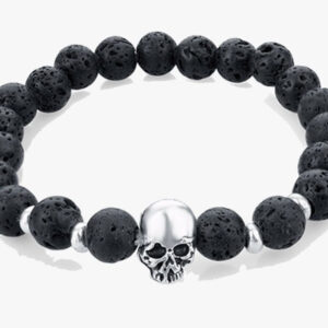 Yoga jewelry, unisex bracelet with 8mm black natural?stone and silver plated skull.?Bracelet measures 19 cm?in length with 8mm beads.